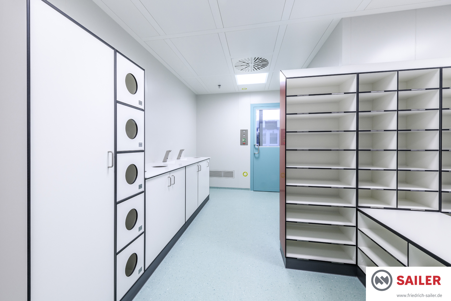 Zum Einsatz kam verschiedenfarbige HPL-Materialien entsprechend der Unternehmensfarben. Dabei wurde vor allem das HPL-Material HPL1 mit einer Oberflächenrauheit Ra < 0,7 µm für Schuhfächer, Schränke und Waschtische verwendet. Für stark beanspruchte Oberflächen von Sit-over Bänken kam das HPL-Material HPL2 mit einer Oberflächenrauheit Ra < 1,5 µm zum Einsatz.