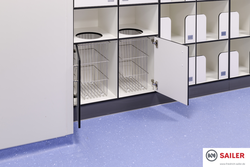 Für die Aufnahme von benutzter Einmalkleidung werden Edelstahl-Drahtgitterkörbe eingesetzt, die mit speziellen Kunststofffüssen versehen wurden, um das Material in den Schränken zu schonen.