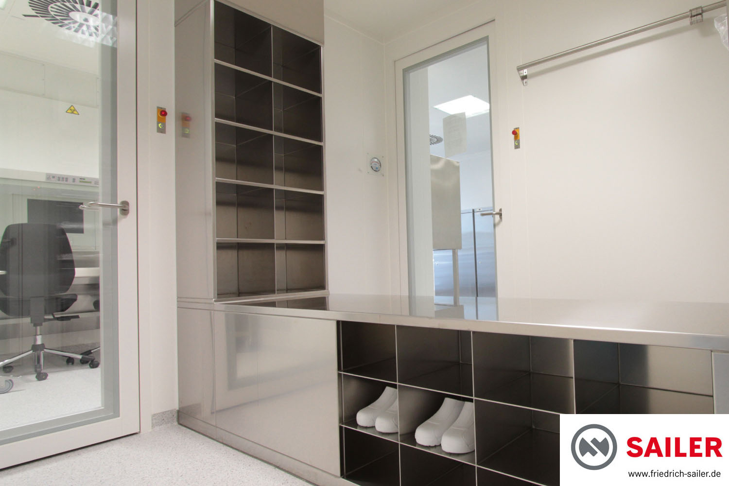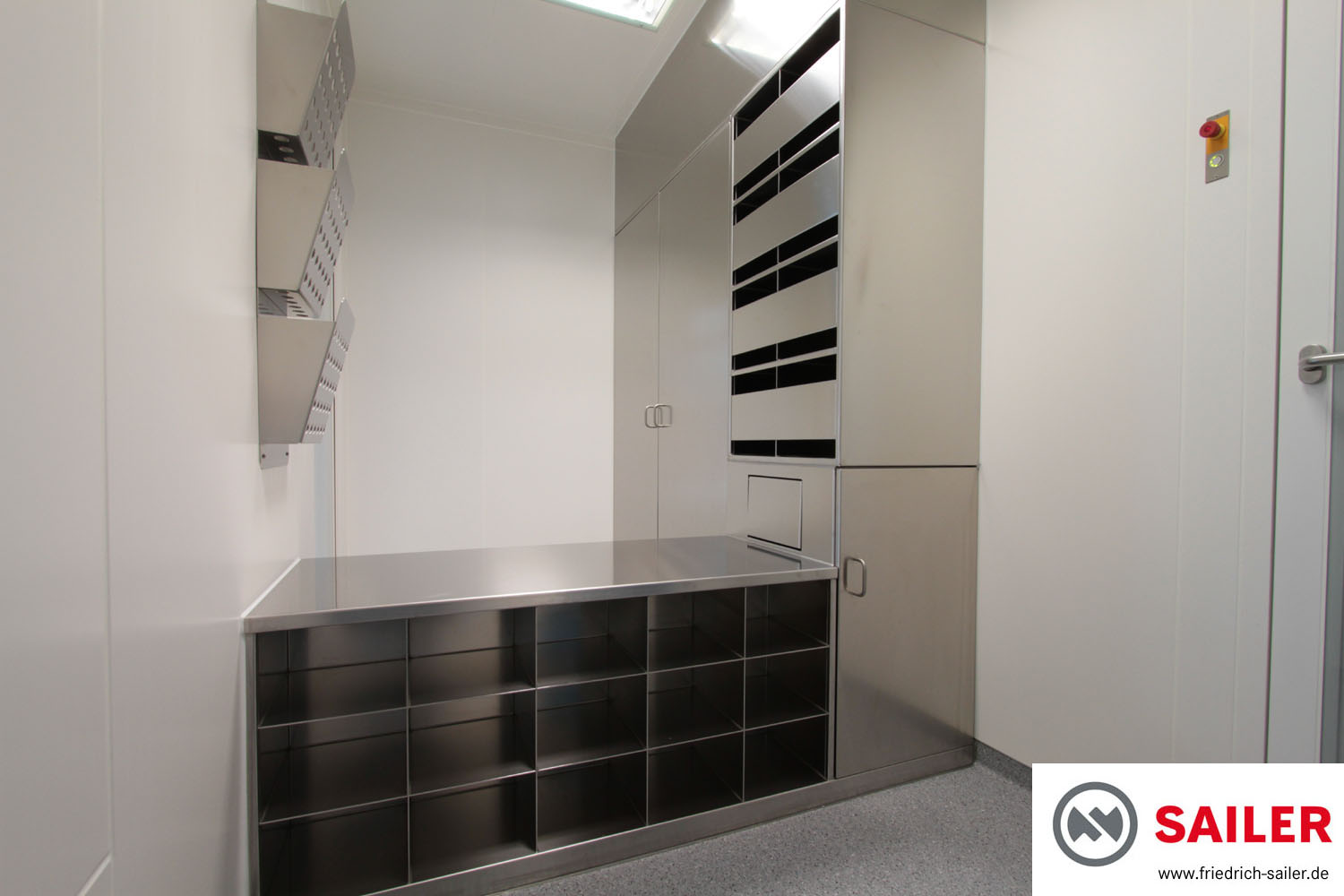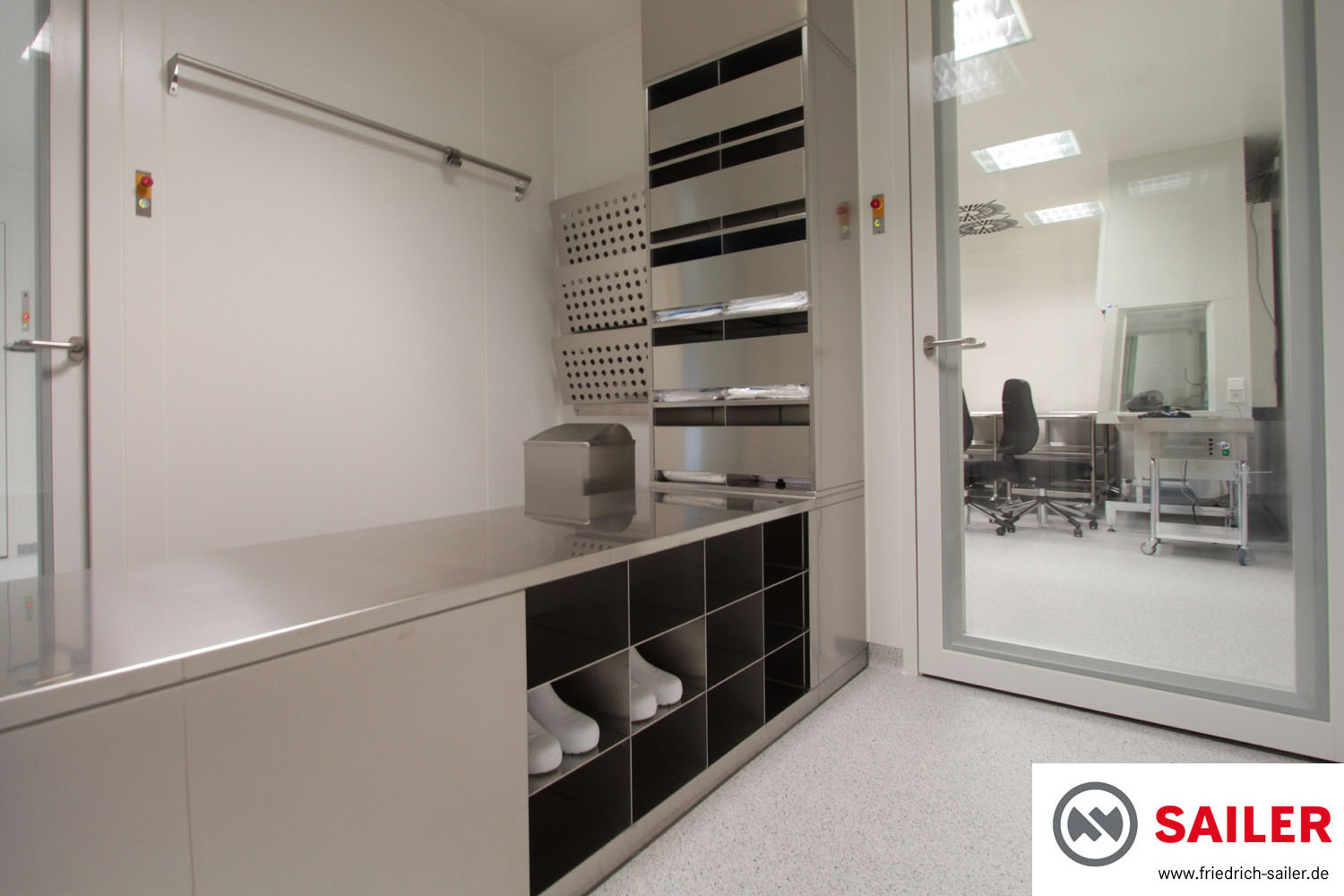 Maßgenaue Einpassung von Spinden, Sit-over-Bänken, Spendersystemen etc. in Personalschleusen für Übergänge zwischen Graubereichen nach Reinraumklasse D, Reinraumklasse D nach C sowie C nach B
