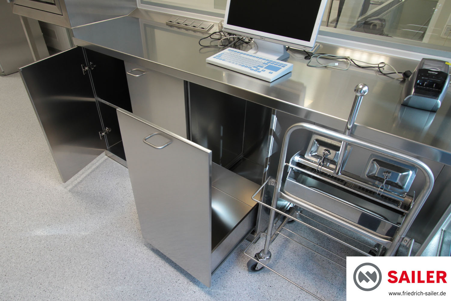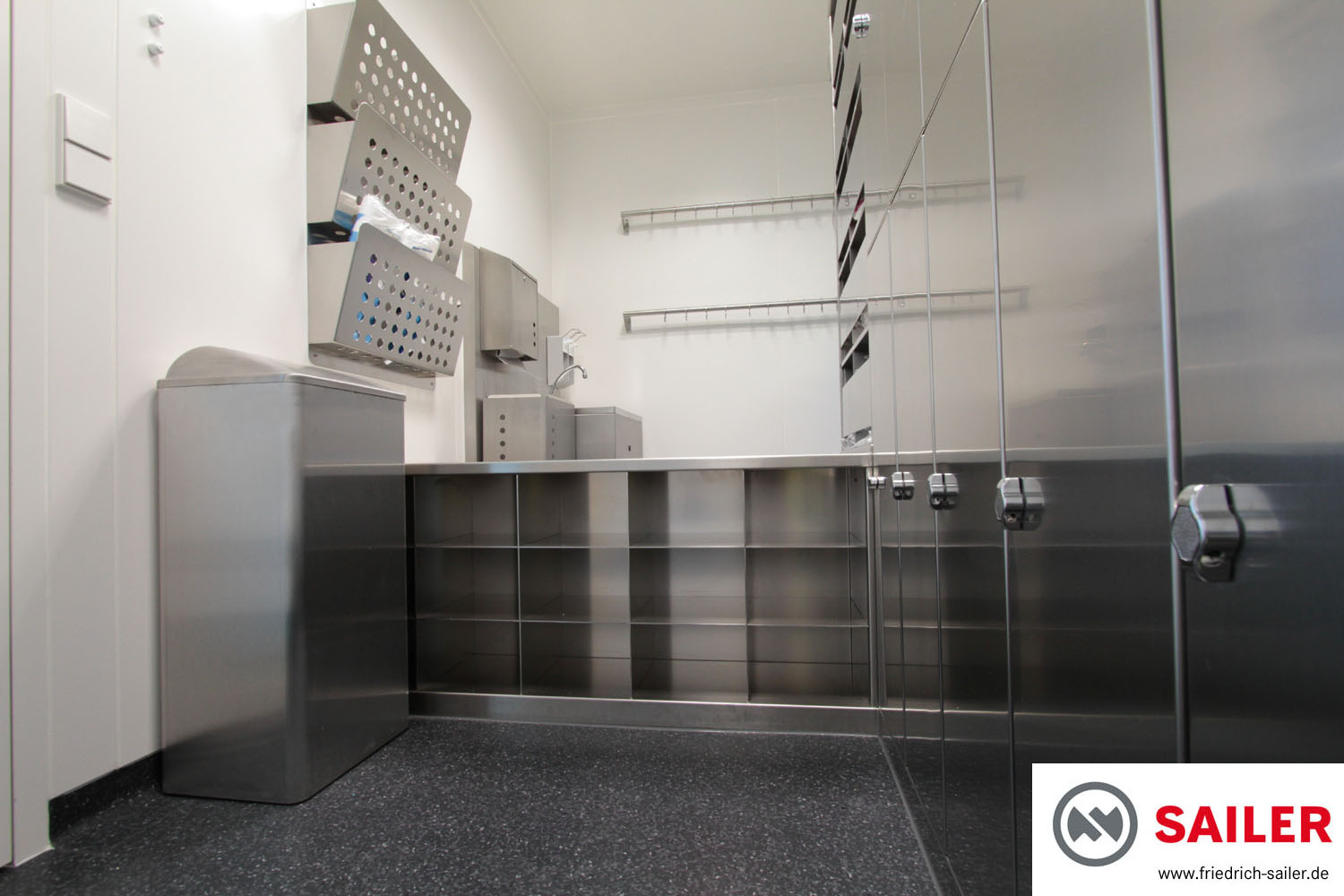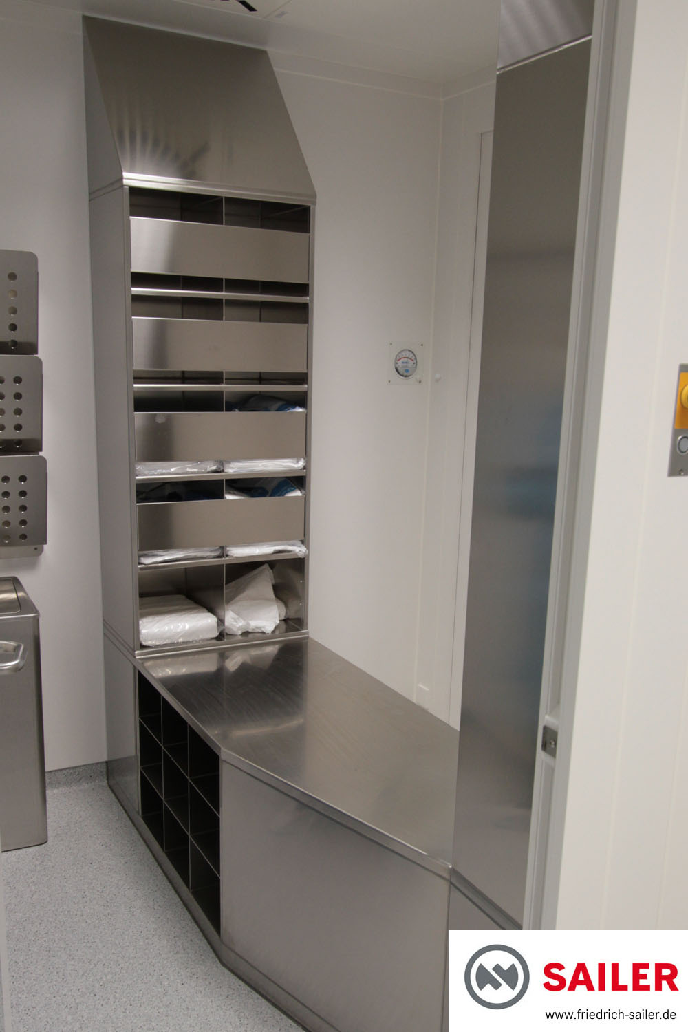 Maßgenaue Einpassung von Spinden, Sit-over-Bänken, Spendersystemen etc. in Personalschleusen für Übergänge zwischen Graubereichen nach Reinraumklasse D, Reinraumklasse D nach C sowie C nach B