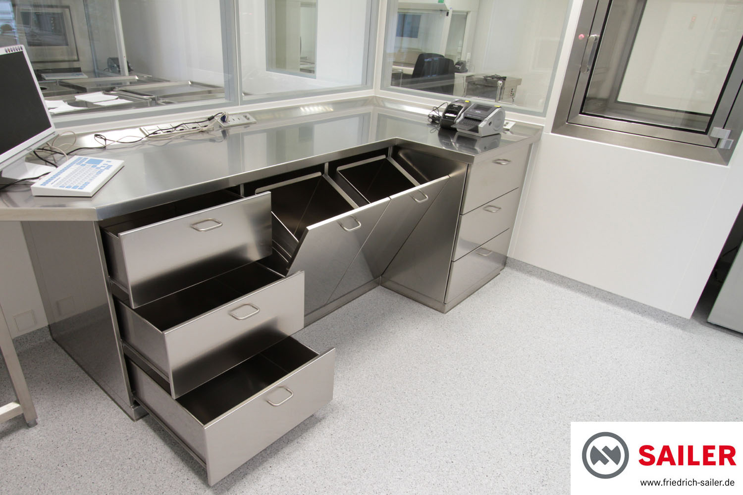 Maßgenaue Reinraumarbeitsplätze nach Kundenanforderungen mit integrierten Medienzuführungen für die Bereiche Verpackung, Konfektionierung und Kommissionierung (Reinraumklasse C)