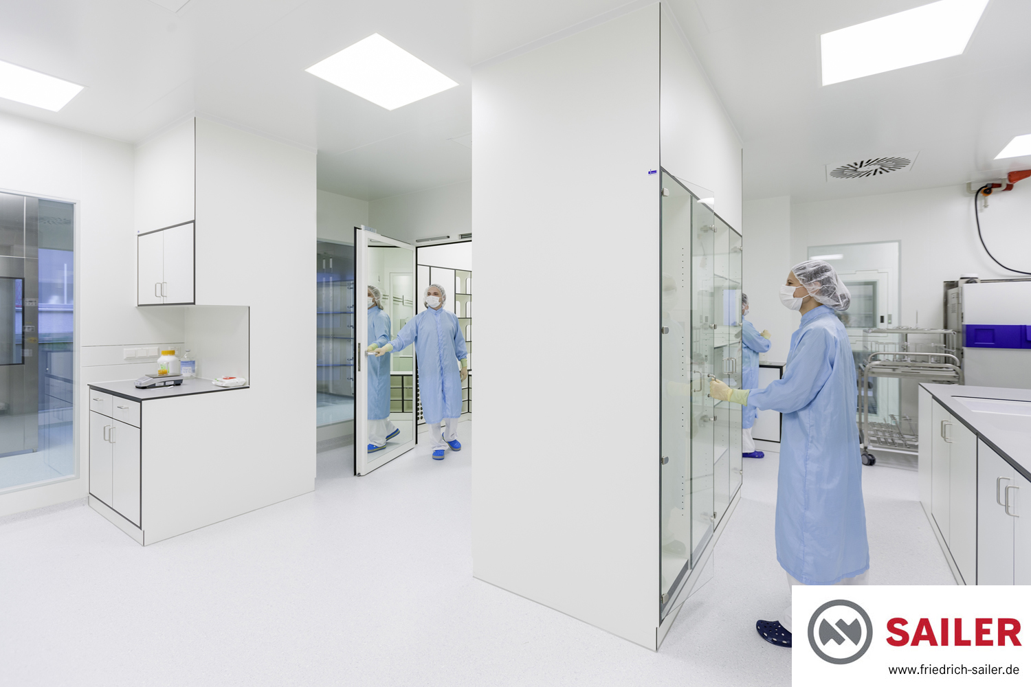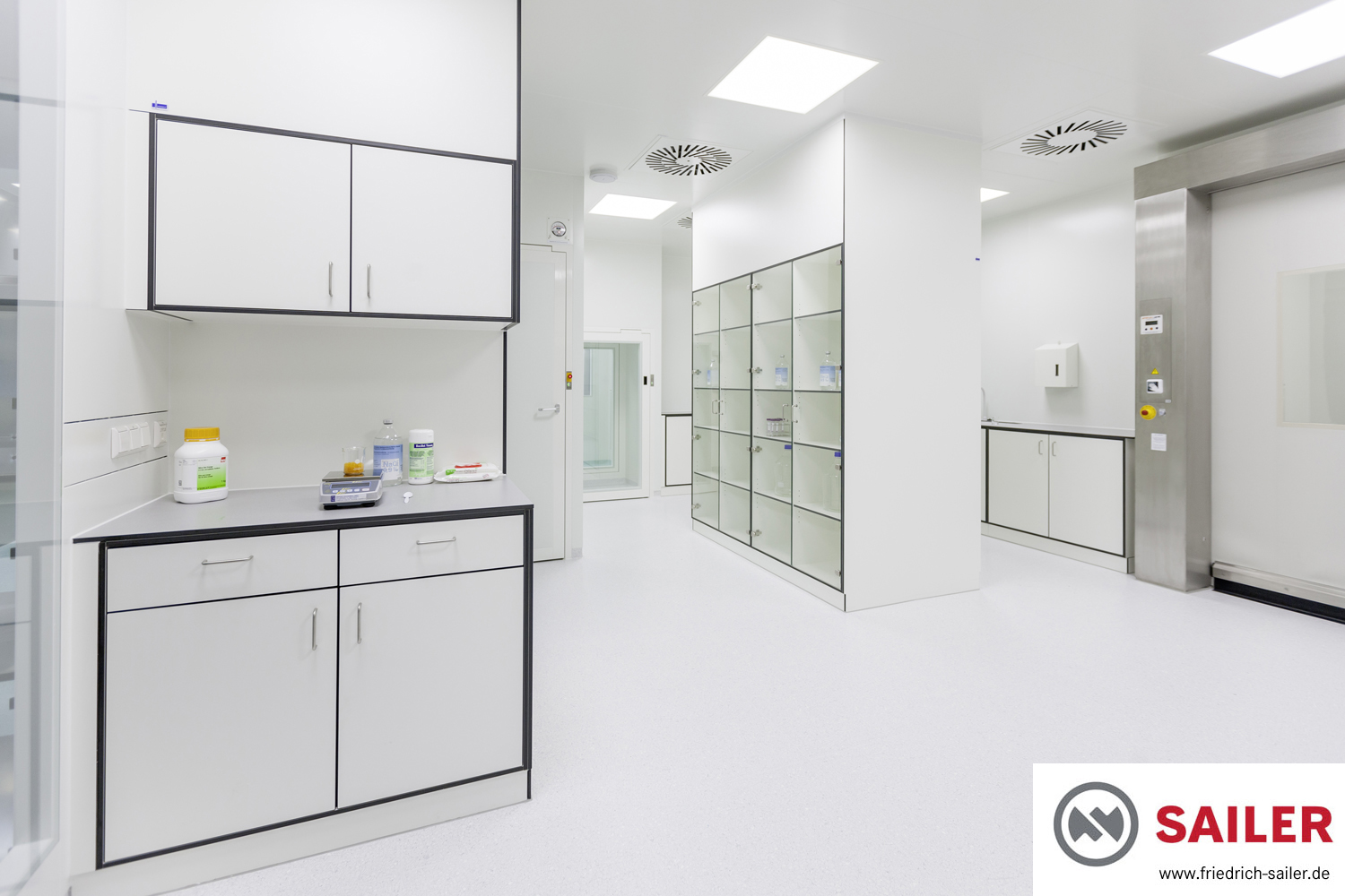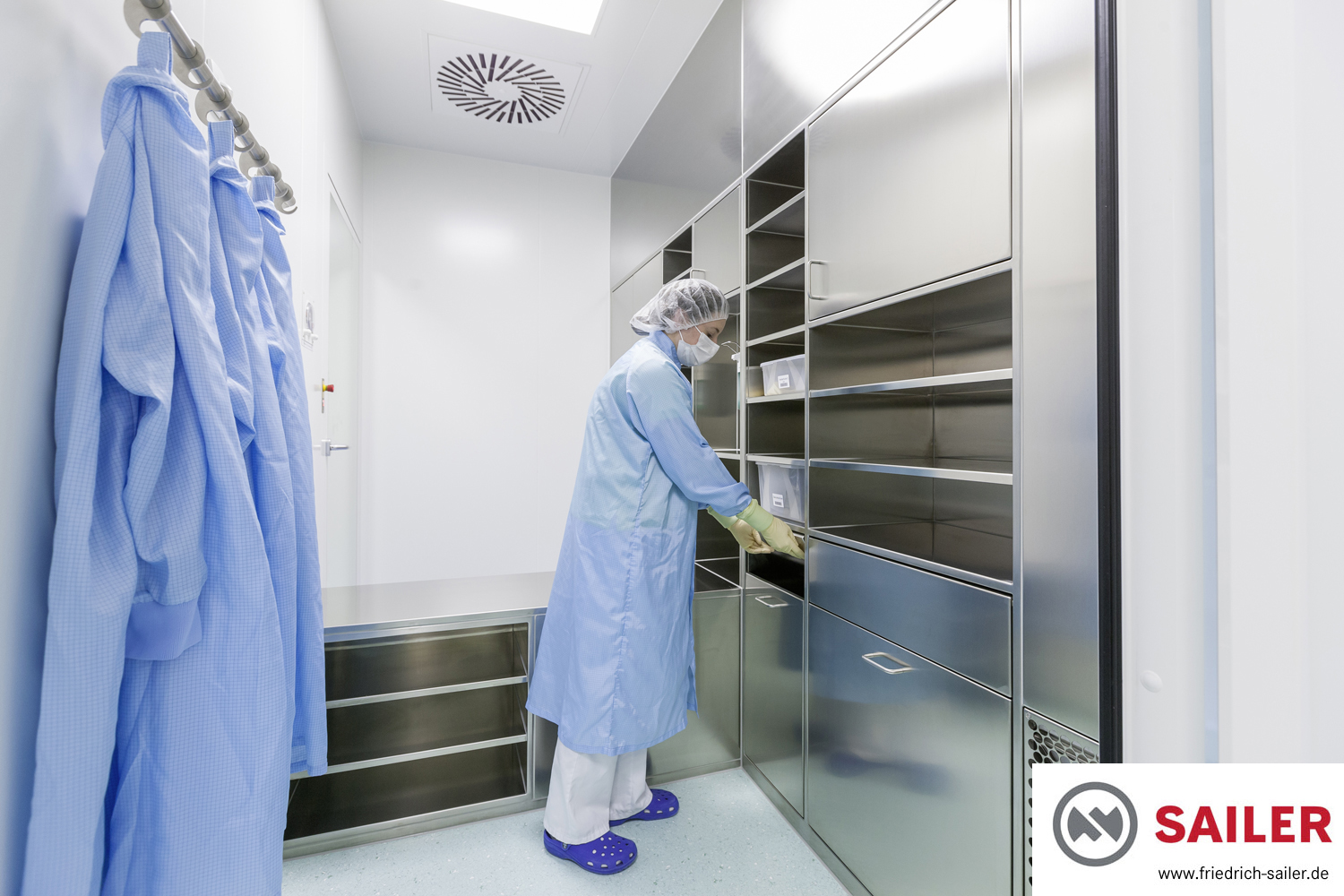 CuraFaktur profitiert außerdem davon, dass die Abluftführung in den Personalschleusen und anderen Räumen von uns in die Möbel integriert wurden. Dadurch mussten keine gesonderten Lüftungsflächen an den Wänden freigehalten werden, was wiederum zu einer besonders effektiven Raumausnutzung führte. Die Rückluft wird dabei durch einen im Möbel integrierten Rückluftkanal bis über die Reinraumdecke geführt.