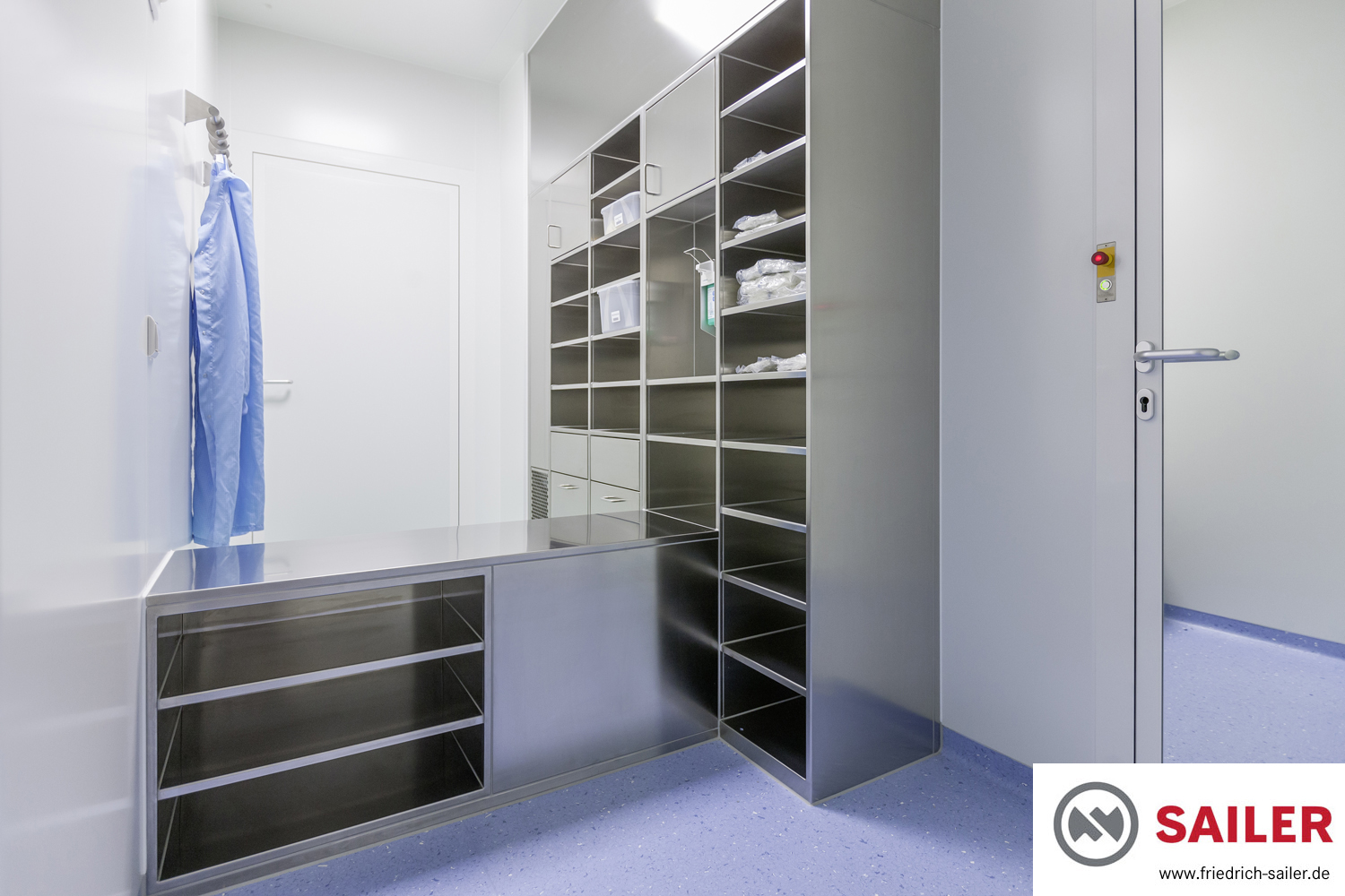 Der von CuraFaktur festgelegte Ein- und Auskleideprozess sowie die entsprechend ausgewählten Bekleidungsartikel wurden bei der Schleusenplanung detailliert einbezogen. Das eingesetzte innovative Kanban-System hinsichtlich der Bekleidungsartikel wird durch dezidierte Stell- und Lagerplätze für die Kanban-Kisten in den Personalschleusen unterstützt: