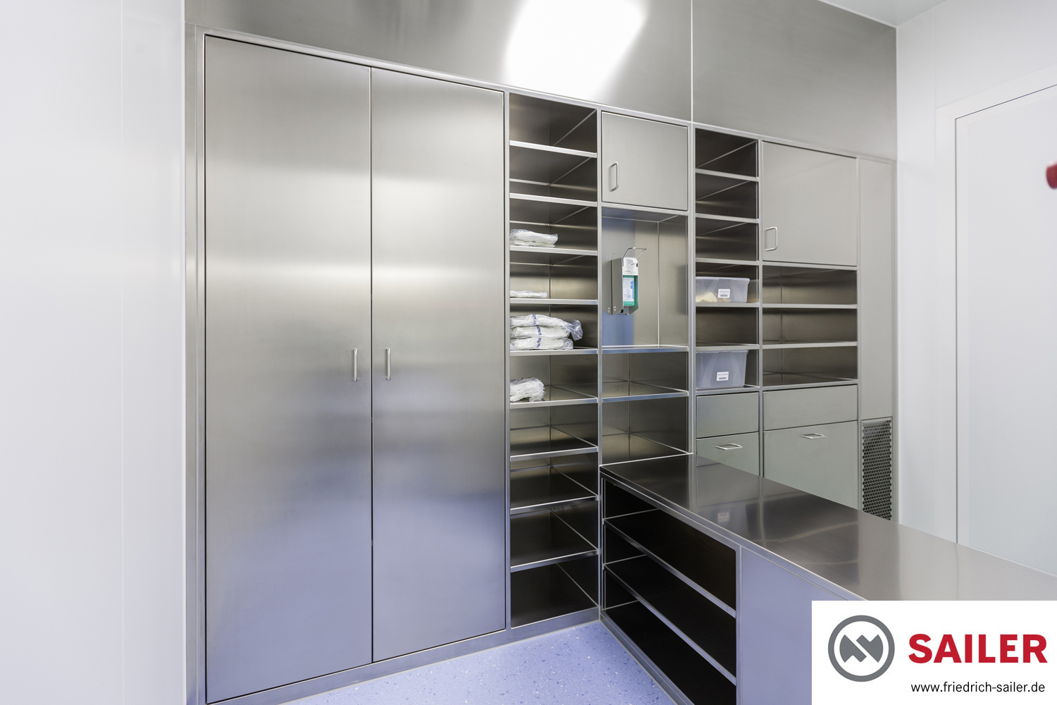 Ein Teil der Lagerschränke wurde nach dem FIFO-Prinzip (First-in-First-out) konzipiert und kann somit von einer Seite bestückt und von der anderen Seite entnommen werden. Die beidseitige Zugänglichkeit erhöht die Lagerkapazität und unterstützt die Arbeitsprozesse des Kunden hinsichtlich der Effizienz.