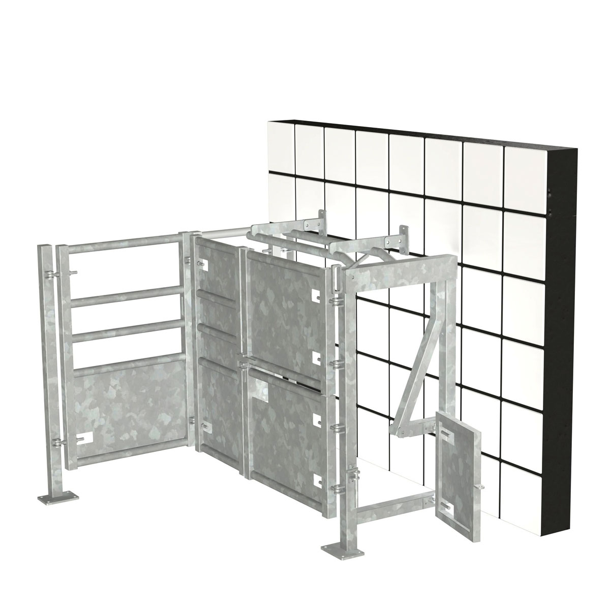 stabile Ausführung, verschweißte Stahlrahmenkonstruktion mit Blechfüllung, komplett feuerverzinkt, zum gefahrlosen Betäuben von Rindern und Schweinen, Eingang und Auslass als Buchtentür, vordere Stirnseite mit manueller Kopffixierung für Rinder, herunterklappbarer Übersprungschutz mit Buchtentürarretierung und zwei Querbügeln, die das Hochsteigen der Rinder verhindern, durch Umstellen der Buchtentüre und Herunterklappen des Übersprungschutzes auch zum Betäuben von Schweinen einsetzbar, oberer Flügel der Buchtentüre zum hindernisfreien Aufnehmen der Schweine auf die Entblutebahn zu öffnen