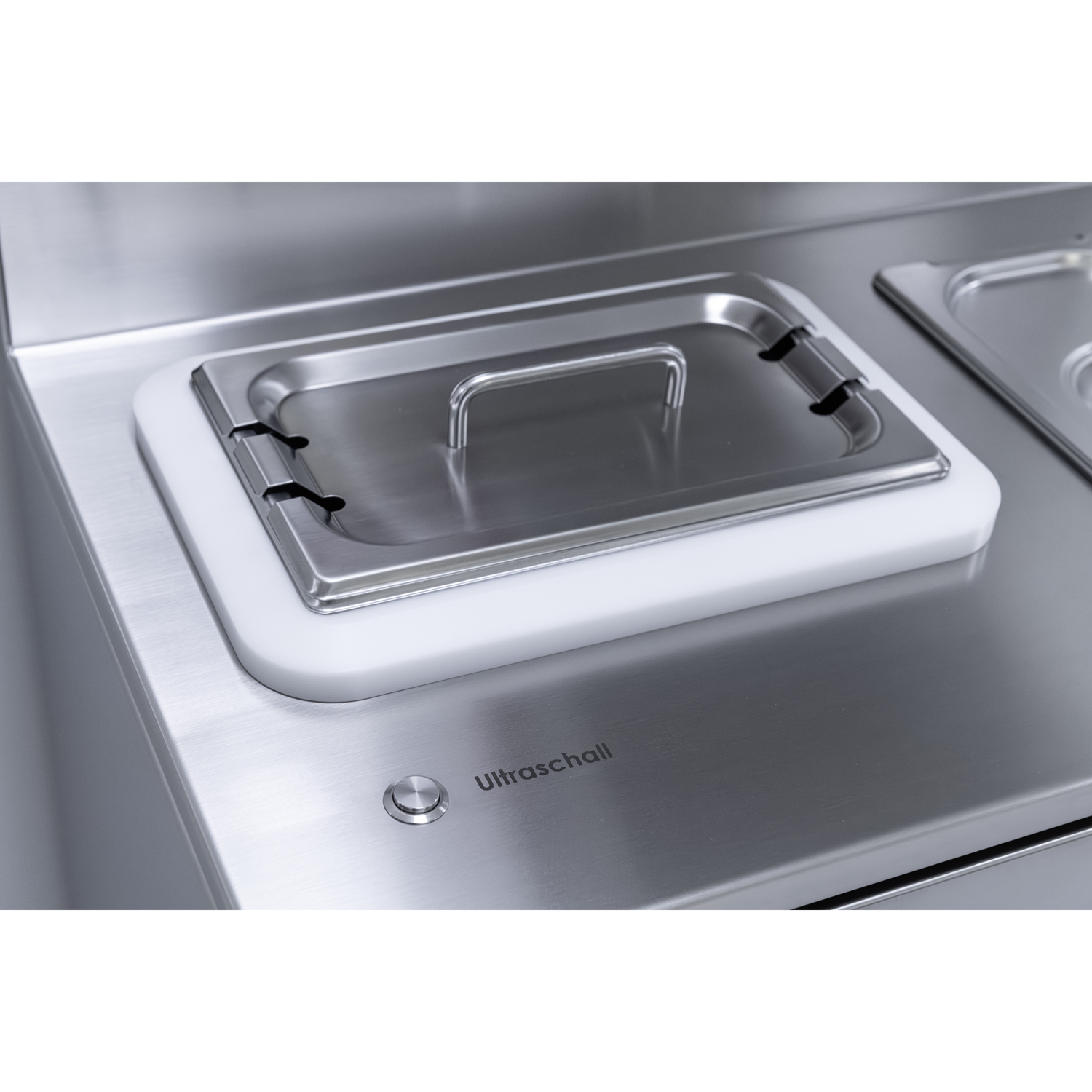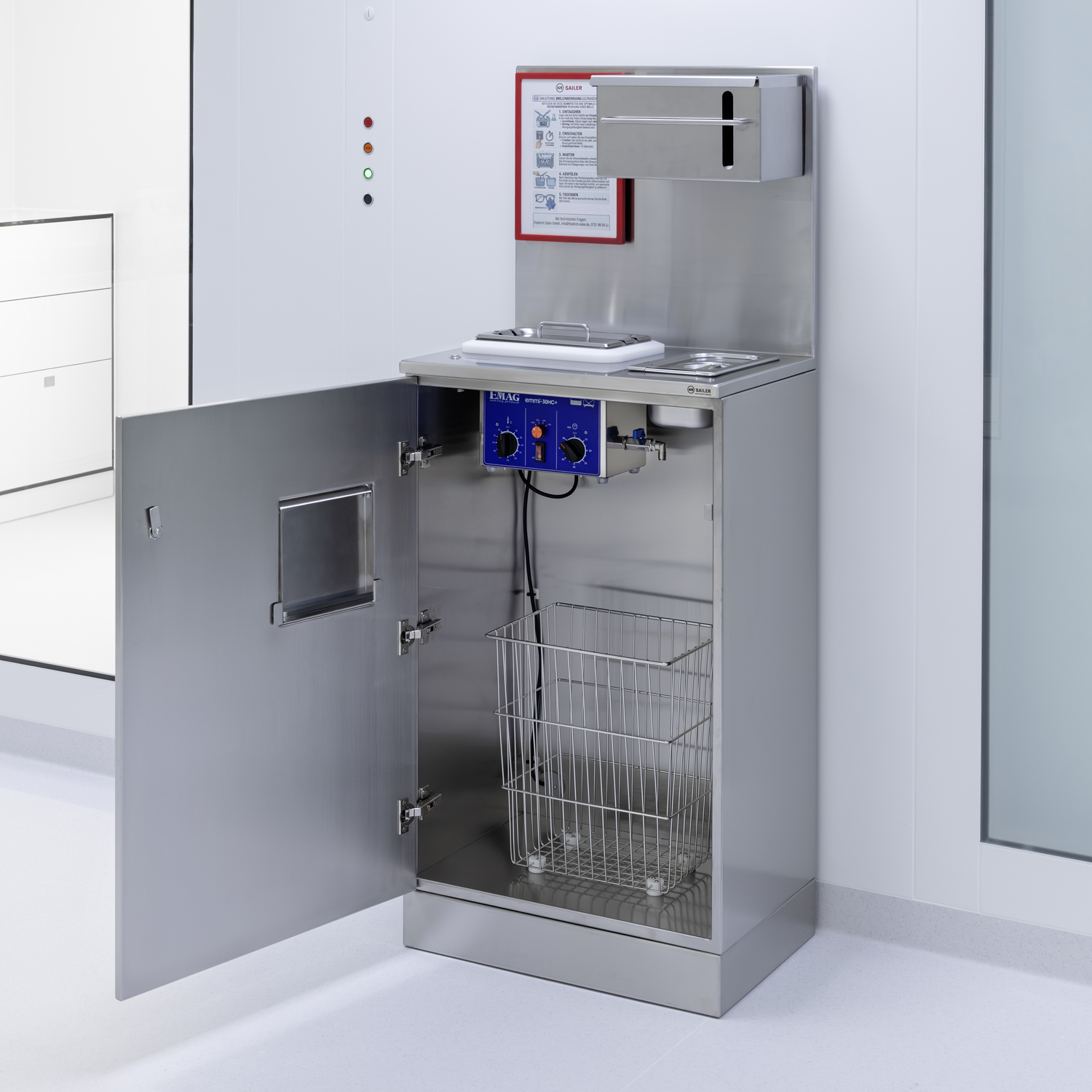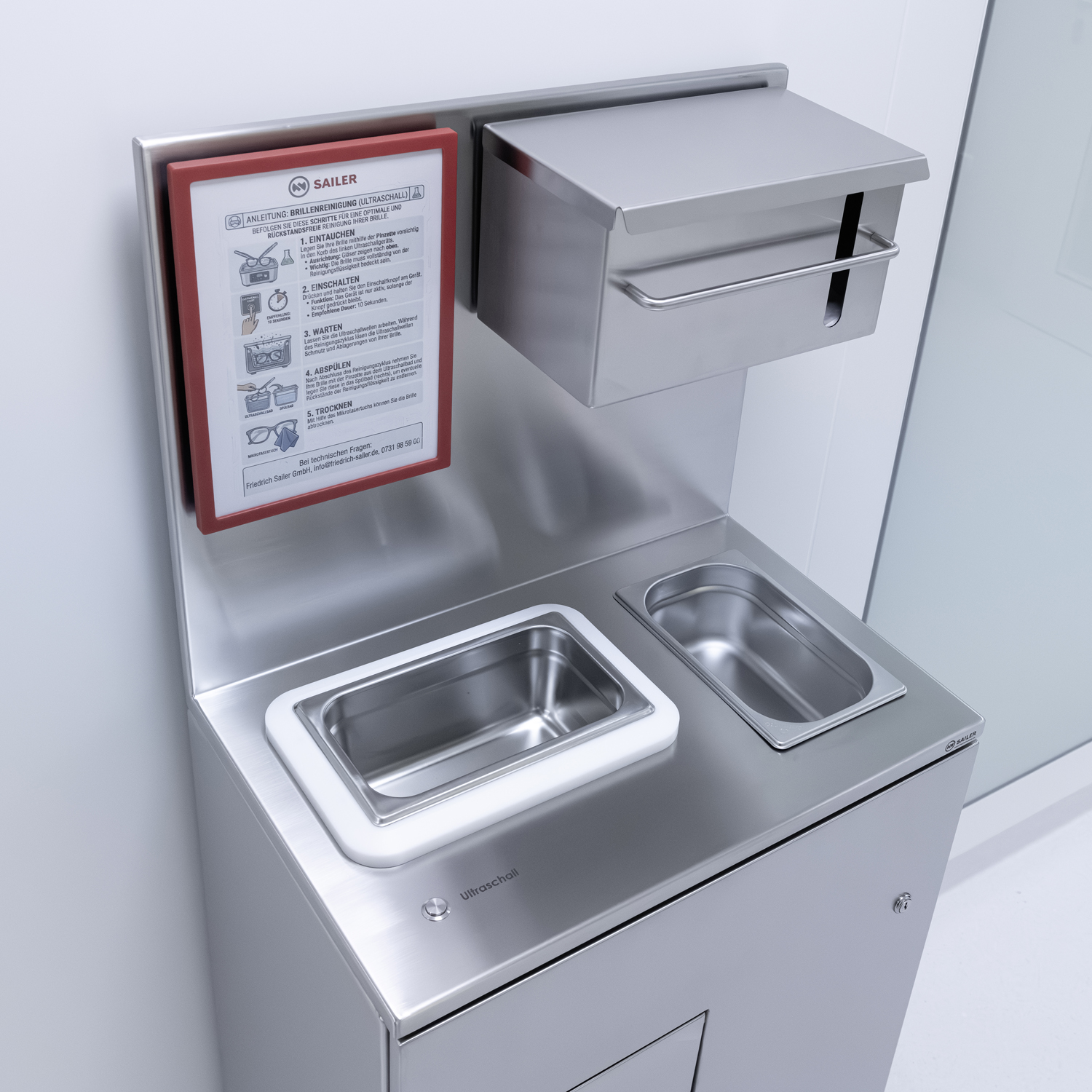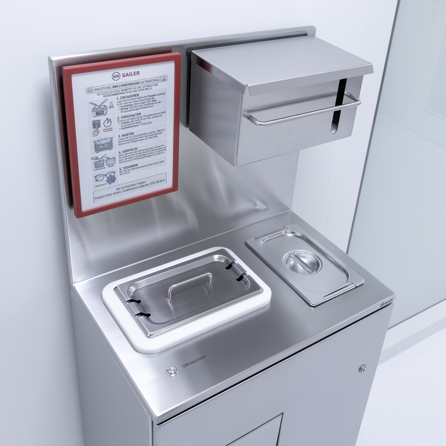 aus Edelstahl Werkstoff 1.4301, Oberfläche gebürstet, Oberflächenrauheit Ra < 0,8µm, Gehäuse in doppelschaliger Bauweise für Reinräume und Personalschleusen, in der Arbeitsfläche ist ein hochwertiges Ultraschallbad sowie ein wechselbarer Behälter zum Klarspülen der Brillen nach der Reinigung integriert, das Ultraschallbad wird über einen Taster aktiviert und verfügt über einen Ablasshahn im Unterschrank, rückseitige Aufkantung mit Spenderbox für Microfasertücher und Montagepunkt für Dokumentenhalter (inklusive), Unterschrank mit abschließbarer Flügeltür und Einwurf für benutzte Microfasertücher, inkl. Drahtgitterkorb 35 Liter aus Edelstahl, Korpus mit höhenverstellbaren Füßen zum Ausgleich von Bodenunebenheiten und Sockelblende,