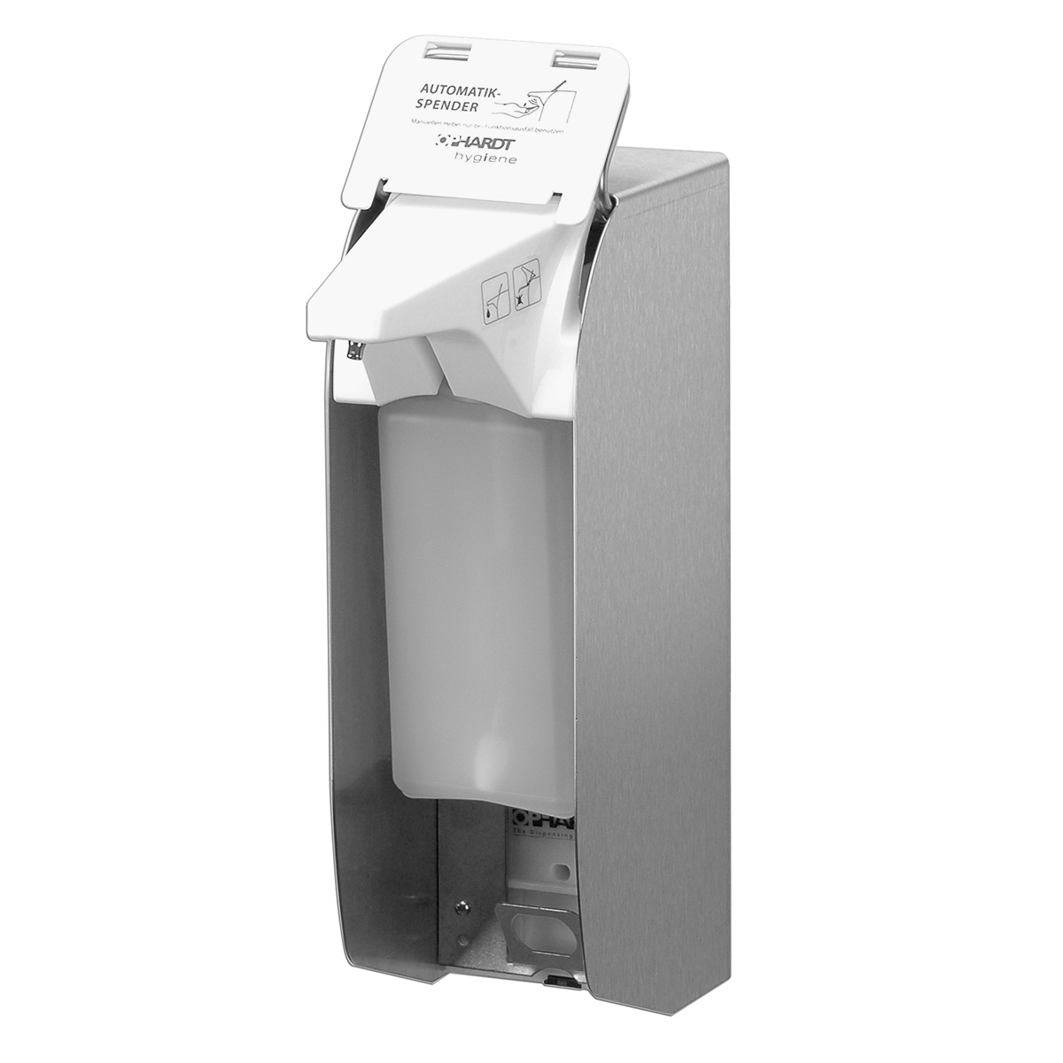 berührungsloser Spender für Flüssigseifen und Desinfektionsmittel, mit Doppelsensor-Auslösung, Gehäuse aus geschliffenem Edelstahl, austauschbare langlebige Qualitäts-Edelstahlpumpe mit gekröpftem Saugrohr für besonders schnelle Erstdosierung, für Flüssigseifen ohne Reibemittel, alkoholische Handdesinfektionsmittel, Lotionen etc., einstellbare Dosierung (ca. 0,75/ 1,0/ 1,2/ 1,5 ml je Hub), inkl. 1 Clip und HDPE-Leerflasche, spülmaschinengeeignet (60°C), autoklavierbar (134°C), einfacher Pumpenwechsel durch Frontentnahme, mit permanentem Notbedienhebel aus Edelstahl für Funktionsgarantie bei Batterieleerstand oder Spannungsverlust