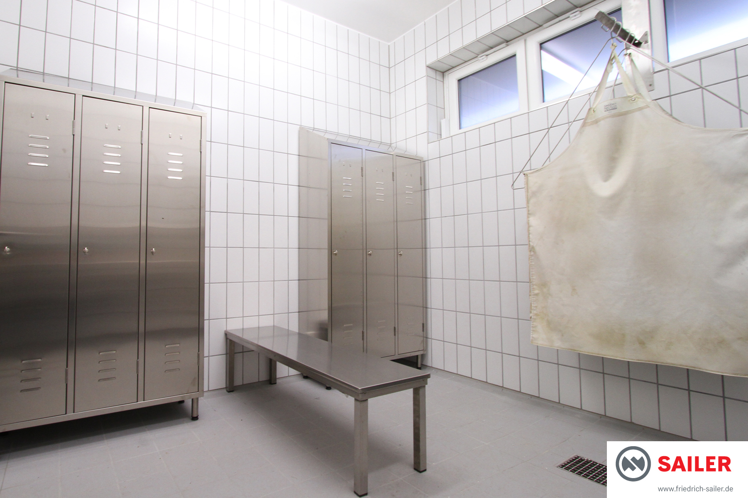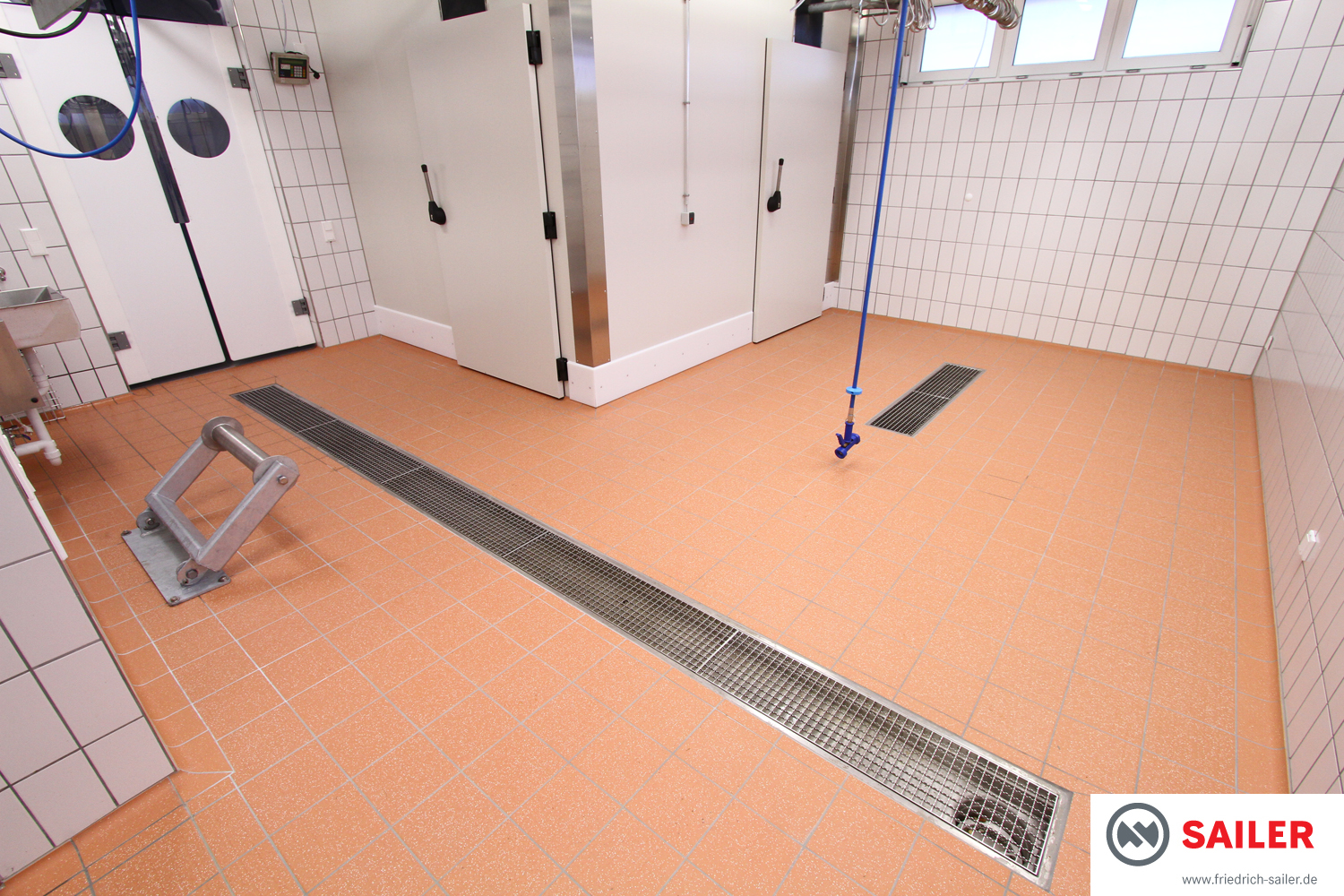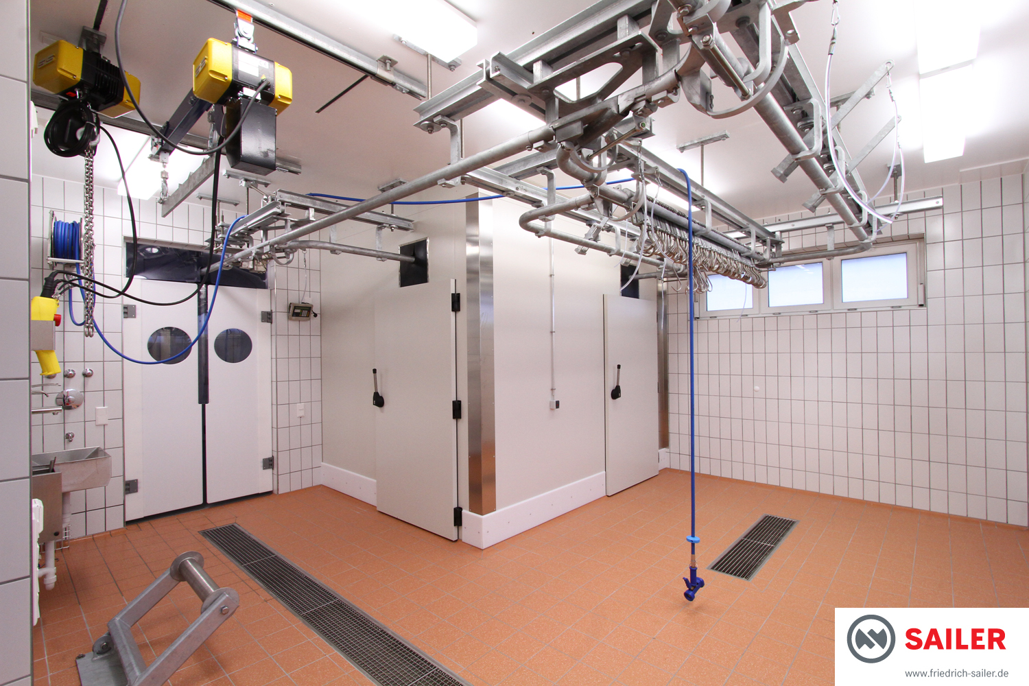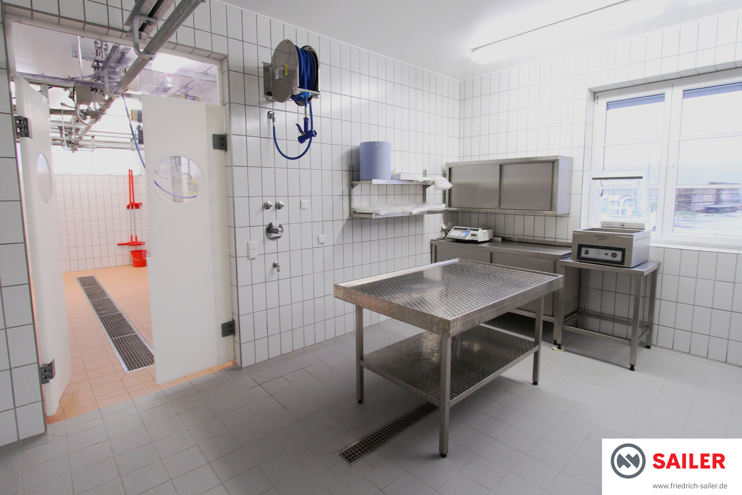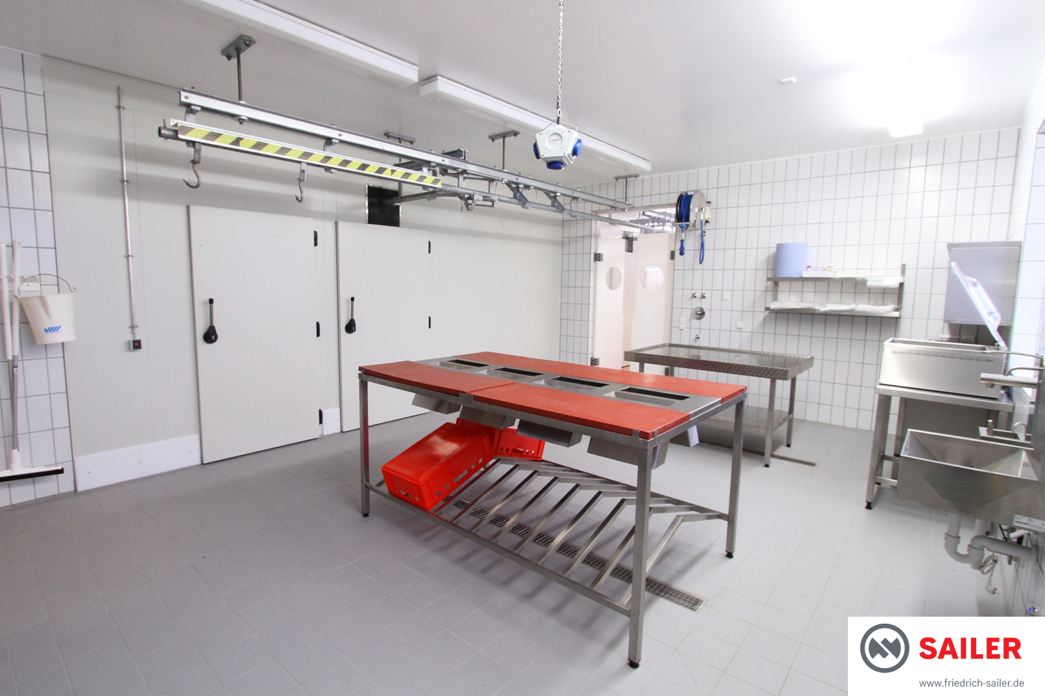 Verarbeitungsbereich zur Feinzerlegung und zum Herstellen von Wurstwaren, Kühlzellen für fertige Produkte, hygienischer und leicht zu reinigender Bodenaufbau mit Edelstahl-Entwässerungsrinnen, Wulstrandtisch und Zerlegtisch für effzientes Arbeiten, Vakuum-Verpackungsgerät, Schlauchaufroller und Einrichtung zur Niederdruck-Schaumreinigung