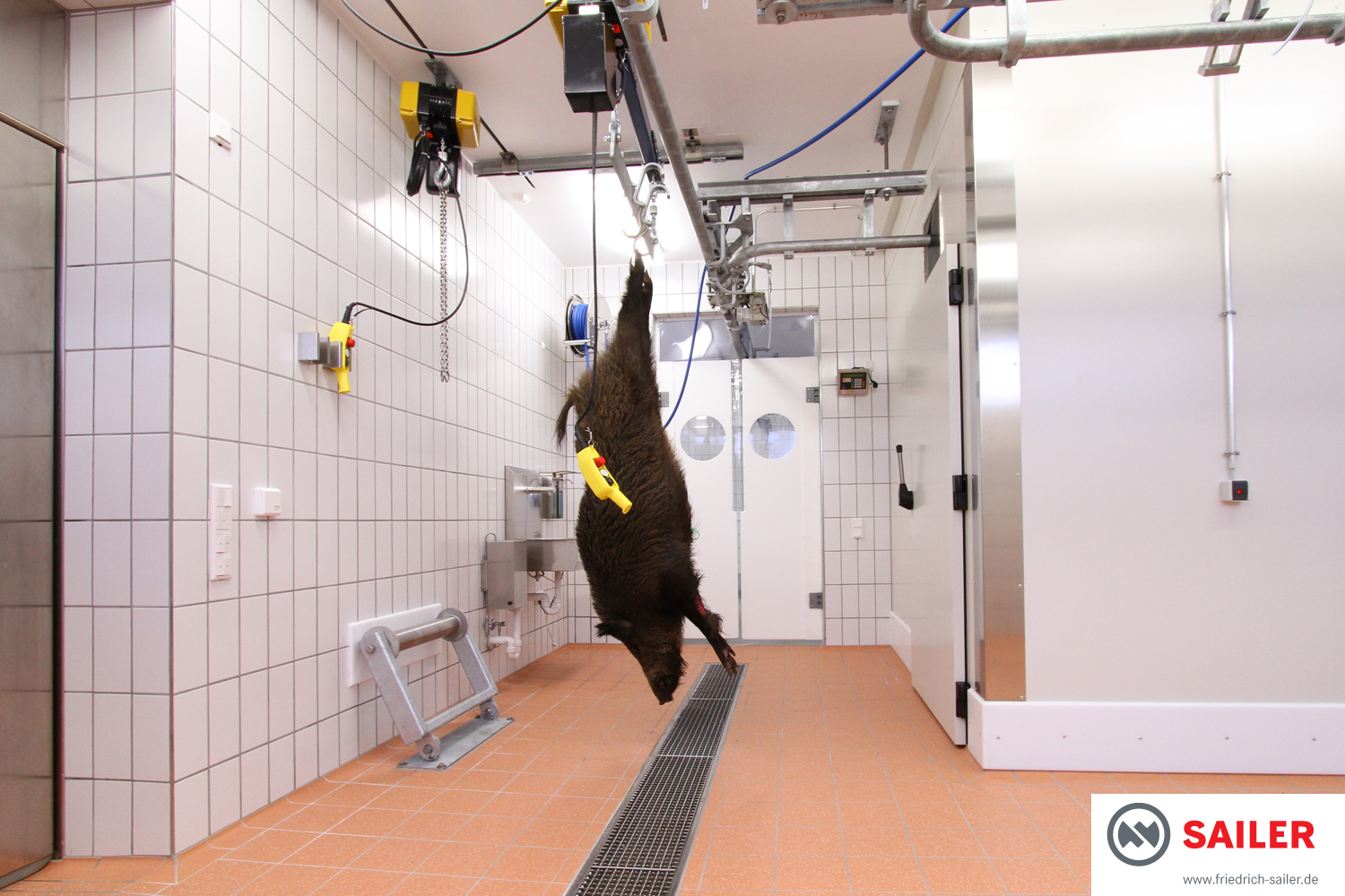 Eingangsbereich mit Rohrbahn zur Aufnahme des erlegten Wildes, professioneller und leicht zu reinigender Bereich zum Aufbrechen und Zerwirken mit Entwässerungsrinnen, Kühlzelle für die Lagerung der erlegten Strecke, Synchron-Aufzug zum ergonomischen Arbeiten, Handwascheinrichtung für hygienisches Arbeiten